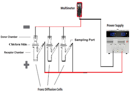 Iontophoresis Studies with Franz Diffusion Cell: Iontophoresis is the use of small electric currents to deliver the active substance to the body at a controlled rate. The electric current is carried by the drug ions and other ions in physiological liquids. Substance molecules can be electrically pushed or pulled through membranes quickly and controlled. The power supply was set to deliver the necessary amount of current to each sample each time which were 1mA, 2.5mA and 5mA respectively. As the experiment proceeded due to the change in system resistance the voltages were altered to maintain a stable current flow.