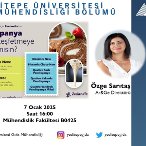 07.01.2025 tarihinde saat 16.00'da Mühendislik Fakültesi B0425 nolu sınıfta, Zeelandia firması Ar-Ge Direktörü Özge SARITAŞ seminer verecektir. Gıda Mühendisliği bölümü üyeleri ve öğrencileri etkinliğe davetlidir.