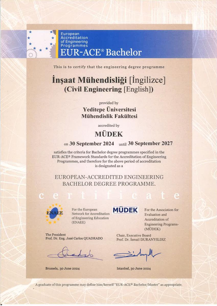 Yeditepe Üniversitesi İnşaat Mühendisliği Bölümüne, MÜDEK-Mühendislik Eğitim Programları Değerlendirme ve Akreditasyon Derneği tarafından akreditasyon verilmiştir. MÜDEK, Yükseköğretim Kalite Kurulu (YÖKAK) tarafından verilen Kalite Değerlendirme ve Tescil Belgesine sahiptir.